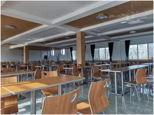 新餐廳是2層結(jié)構(gòu)。一樓為員工餐廳,位置很大,能容下100多人同時(shí)就餐。購置了漂亮的餐桌,一人一個(gè)位置。
