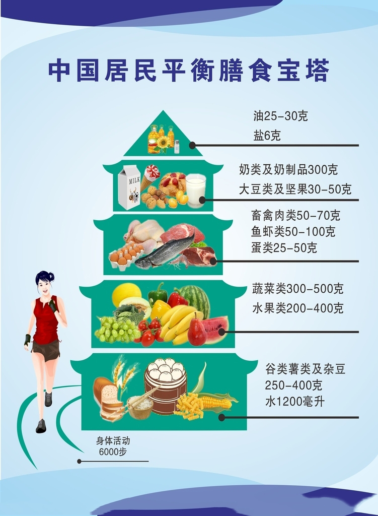 蔬果,水果,奶類和大豆及制品是平衡膳食的重要組成部分,堅果是膳食的有益補充。蔬菜和水果是維生素,礦物質(zhì),膳食纖維和植物化學(xué)物的重要來源,奶類和大豆類富含鈣,優(yōu)質(zhì)蛋白質(zhì)和B族維生素,對降低慢性病的發(fā)病風(fēng)險具有重要作用。提倡餐餐有蔬菜,推薦每天攝入300~500克,深色蔬菜應(yīng)占1/2.天天吃水果,推薦每天攝入200~359克的新鮮水果,果汁不能代替水果。吃各種奶制品,攝入量相當(dāng)于每天液態(tài)奶300克。經(jīng)常吃豆制品,每天相當(dāng)于大豆25克以上,適量吃堅果。