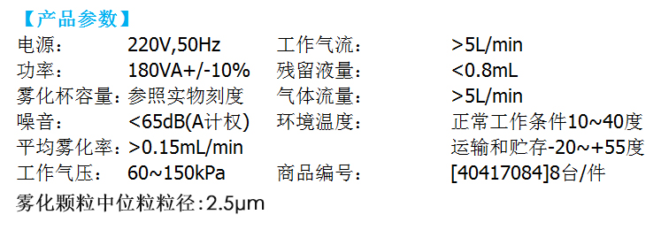 噪音分貝:≤60dB (A) 霧化率:大于0.2mL/min