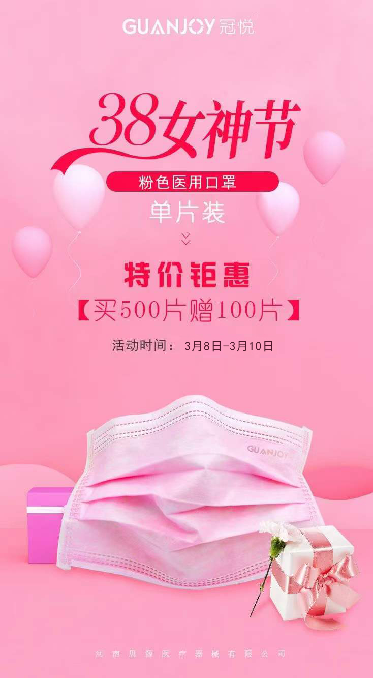 冠悅一次性醫(yī)用口罩,粉色獨立包裝,三層防護,守護女神健康。冠悅粉色醫(yī)用獨立包裝口罩3.8活動來襲,買500片送100片,活動時間:3.8-3.10,聯(lián)系方式:13526647565!