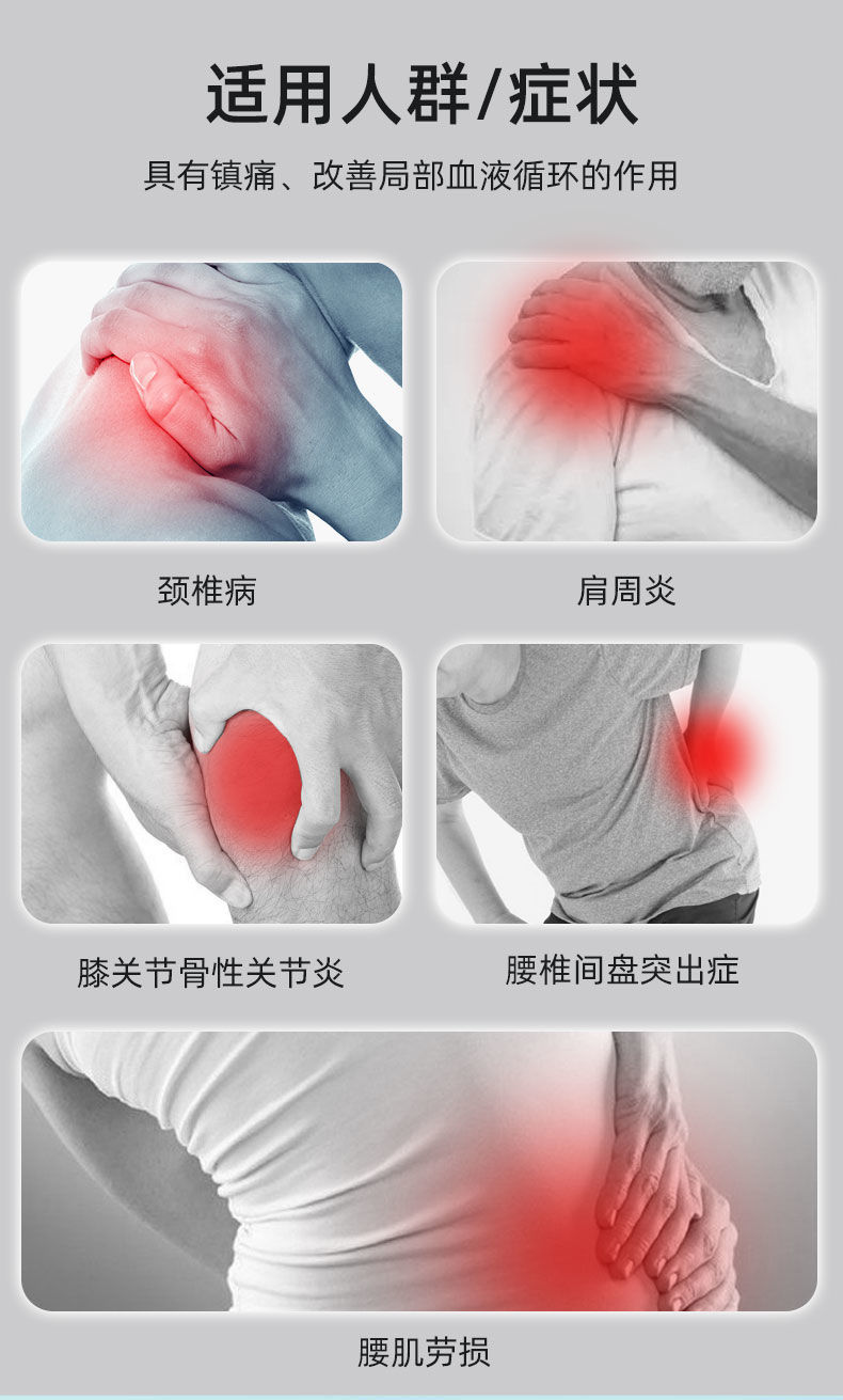 適用范圍:本產(chǎn)品適用于頸椎病、肩周炎、膝關(guān)節(jié)骨性關(guān)節(jié)炎、腰椎間盤突出癥、腰肌勞損等引起的疼痛;具有鎮(zhèn)痛、改善局部血液循環(huán)的作用。
