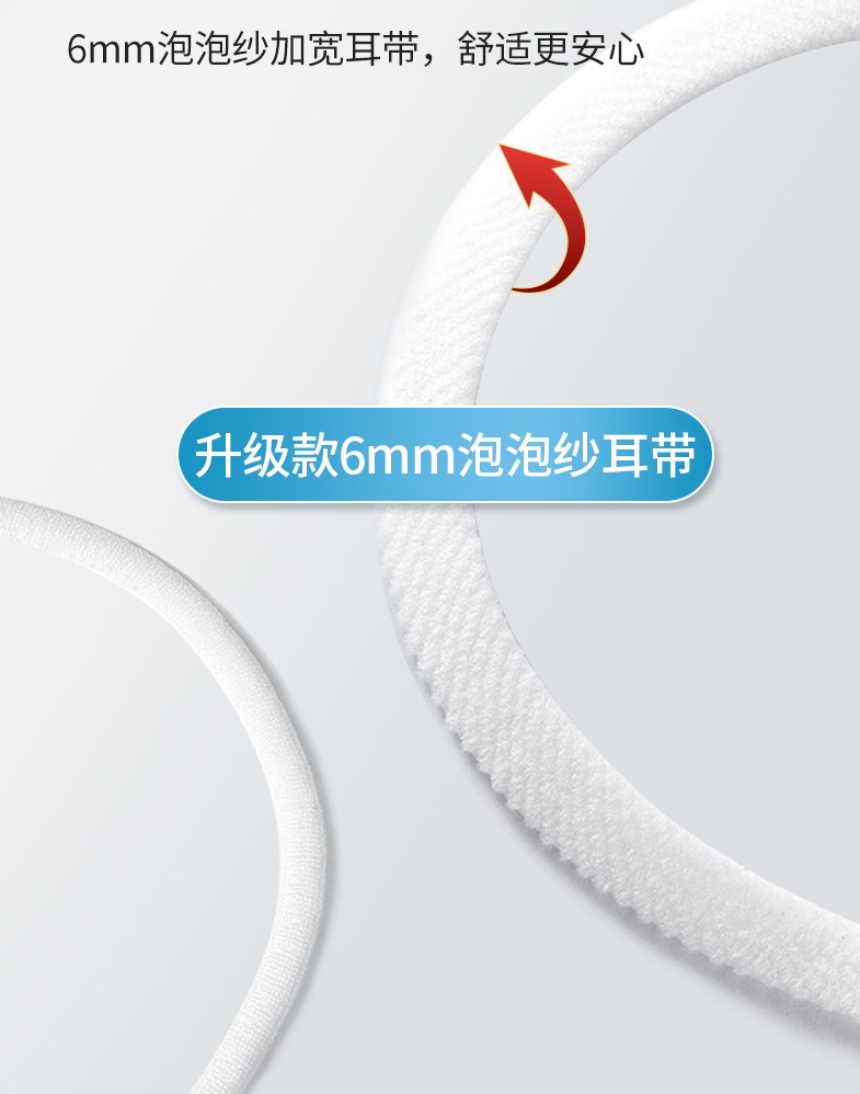 冠悅口罩現(xiàn)在使用的兩種耳帶,一種是扁平的,柔軟舒適,不勒耳朵,一種是寬6mm的泡泡紗耳帶。