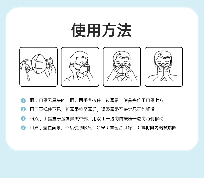 4. 雙手盡量遮蓋口罩并進(jìn)行正壓及負(fù)壓測(cè)試。正壓測(cè)試:雙手遮著口罩,大力呼氣。如空氣從口罩邊緣溢出,即佩戴不當(dāng),須再次調(diào)校頭帶及鼻梁金屬條;負(fù)壓測(cè)試:雙手遮著口罩,大力呼氣。口罩中央會(huì)陷下,如有空氣從口罩邊緣進(jìn)入,即佩戴不當(dāng),須再次調(diào)校頭帶及鼻梁金屬條。