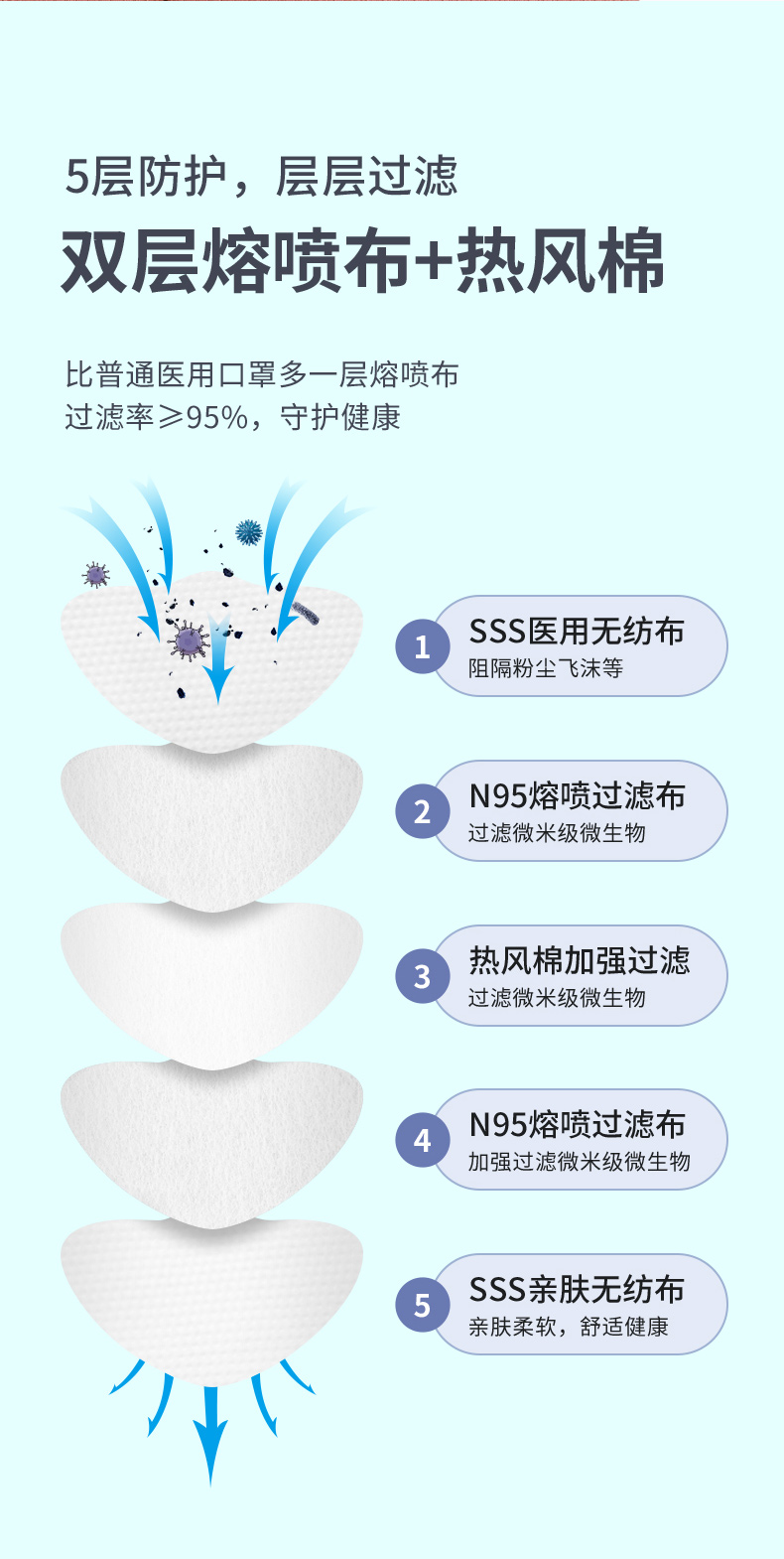 1、N95口罩有兩層熔噴布。N95是過(guò)濾級(jí)別,由于用途不同常見(jiàn)的有四層和六層,其中最外層是做了防水處理的無(wú)紡布,起到防飛沫的效果;第二層是熱風(fēng)棉,主要起到保溫隔熱、防潮防濕等作用;第三層和第四層是兩層經(jīng)過(guò)駐極處理的熔噴布,確保能基本過(guò)濾細(xì)菌懸浮顆粒;最內(nèi)層為柔軟親膚無(wú)紡布,戴著不過(guò)敏,提高佩戴者舒適感。